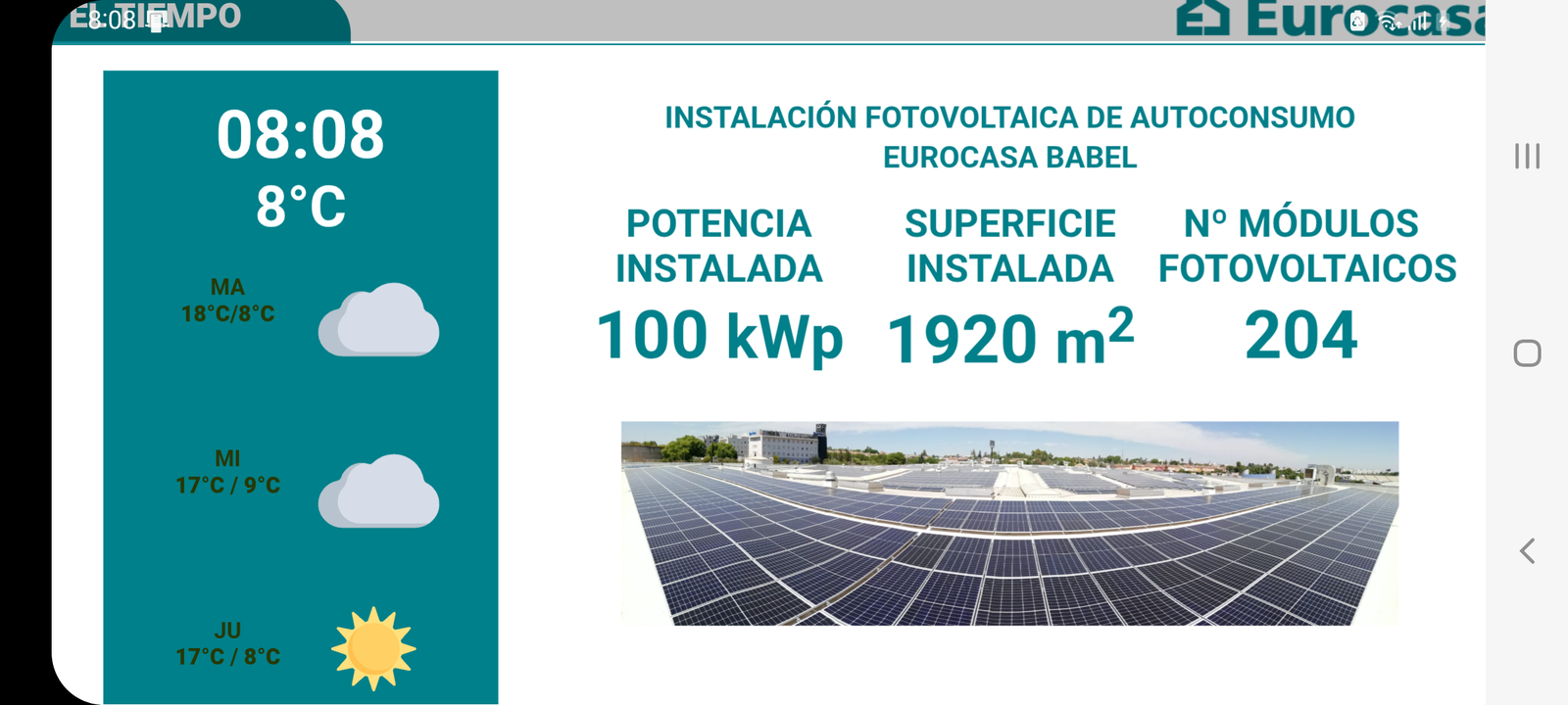 La app permite visualizar datos como la energía producida, el ahorro económico generado, el impacto medioambiental (por ejemplo, árboles preservados), así como información técnica de la instalación. Además, integra contenidos audiovisuales como vídeos corporativos y mensajes publicitarios, convirtiendo cualquier monitor en un potente canal de comunicación y concienciación energética.
