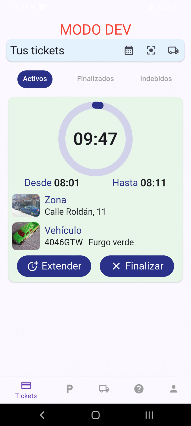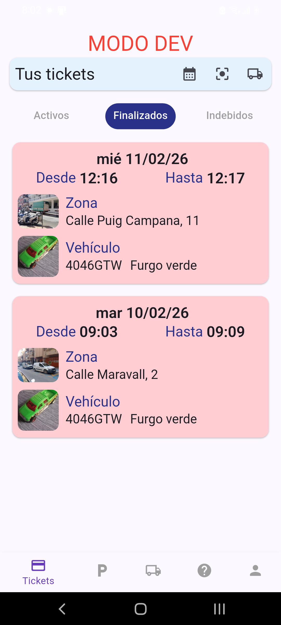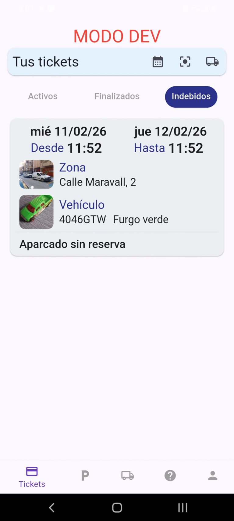 La app permite a los conductores de vehículos de reparto localizar zonas disponibles en el mapa, consultar su estado en tiempo real y generar un ticket digital que habilita el estacionamiento durante el tiempo permitido según la normativa municipal. Además, pueden gestionar sus vehículos, consultar el histórico de tickets (abiertos y cerrados) y recibir notificaciones o sanciones asociadas a su actividad.