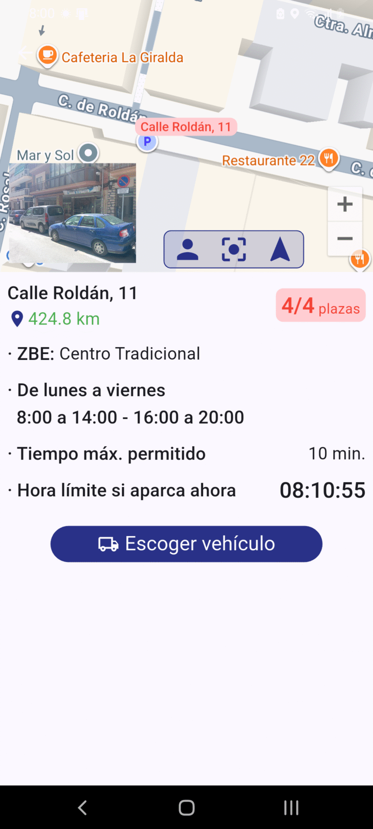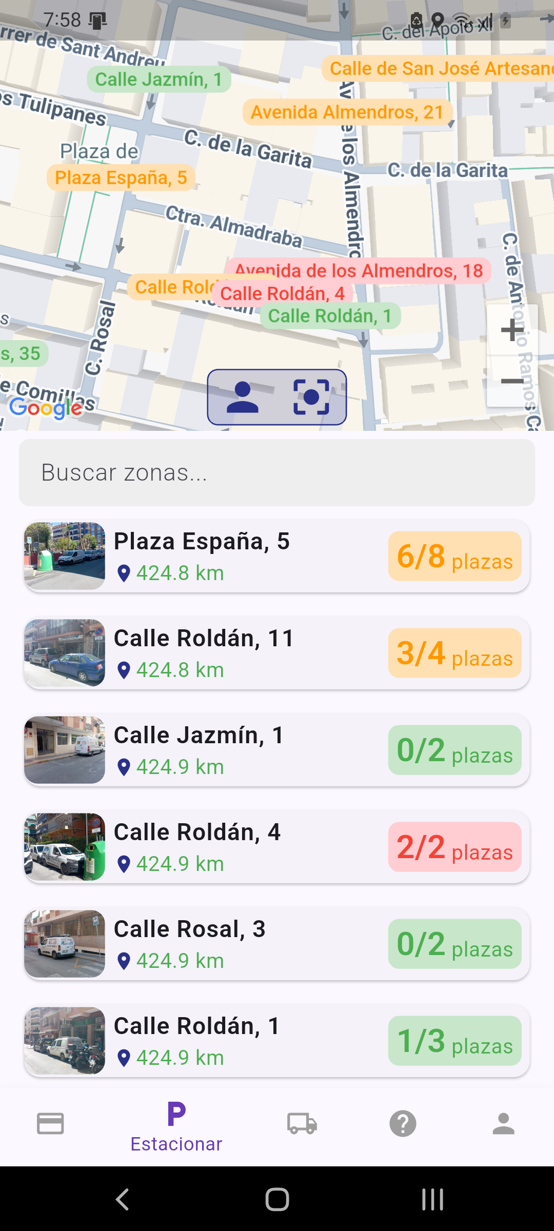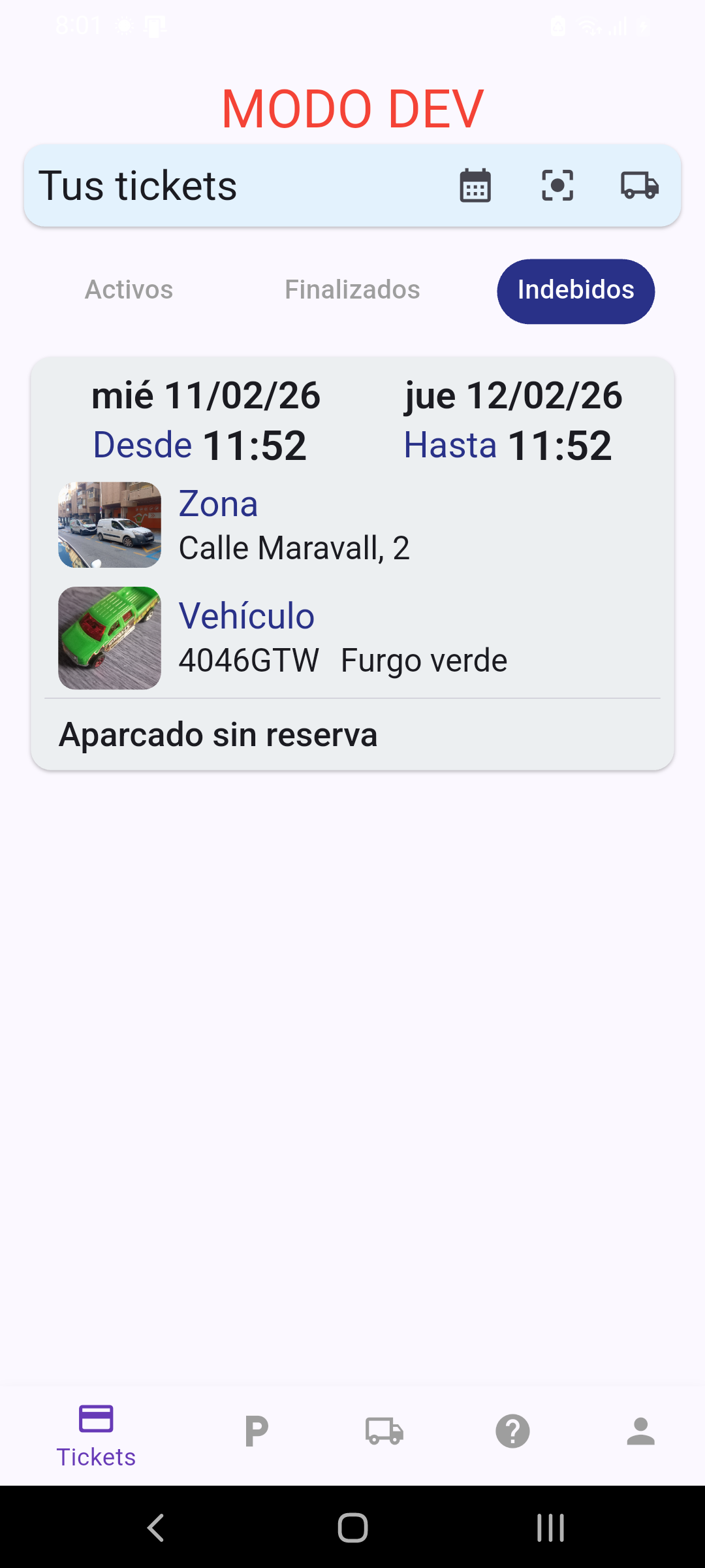 La app permite a los conductores de vehículos de reparto localizar zonas disponibles en el mapa, consultar su estado en tiempo real y generar un ticket digital que habilita el estacionamiento durante el tiempo permitido según la normativa municipal. Además, pueden gestionar sus vehículos, consultar el histórico de tickets (abiertos y cerrados) y recibir notificaciones o sanciones asociadas a su actividad.